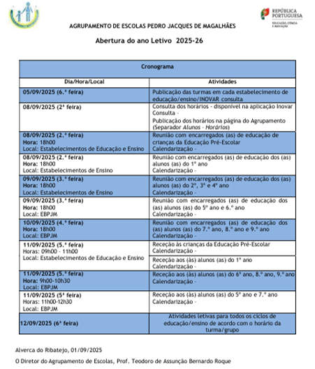 As atividades letivas terão início no dia 11 de setembro, com a receção de todas as turmas/grupos pelos respetivos educadores/professores titulares/diretores de turma/grupo. No dia 12 de setembro, as atividades decorrerão de acordo com o horário regular de cada turma/grupo. Contamos com a participação de todos para um início de ano letivo organizado e motivador!